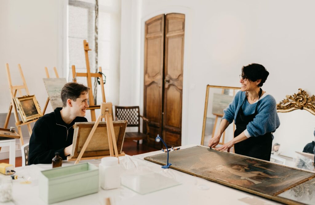 Des fioles à pigments aux multiples nuances, une table pour établir les diagnostics, un bureau débordant d’outils et de documents, des chevalets disposés çà et là. Lorsque l’on pousse les portes de l’atelier Artenicia, on est tout de suite saisis par la poésie du lieu et cette impression singulière d’entrer dans un monde à part. Les œuvres en attente de renouveau y abondent, formant une polyphonie de styles et de couleurs. Deux portraits familiaux répondent à un grand tableau contemporain, tandis que de petites pièces italiennes à la forme originale habillent l’espace.
