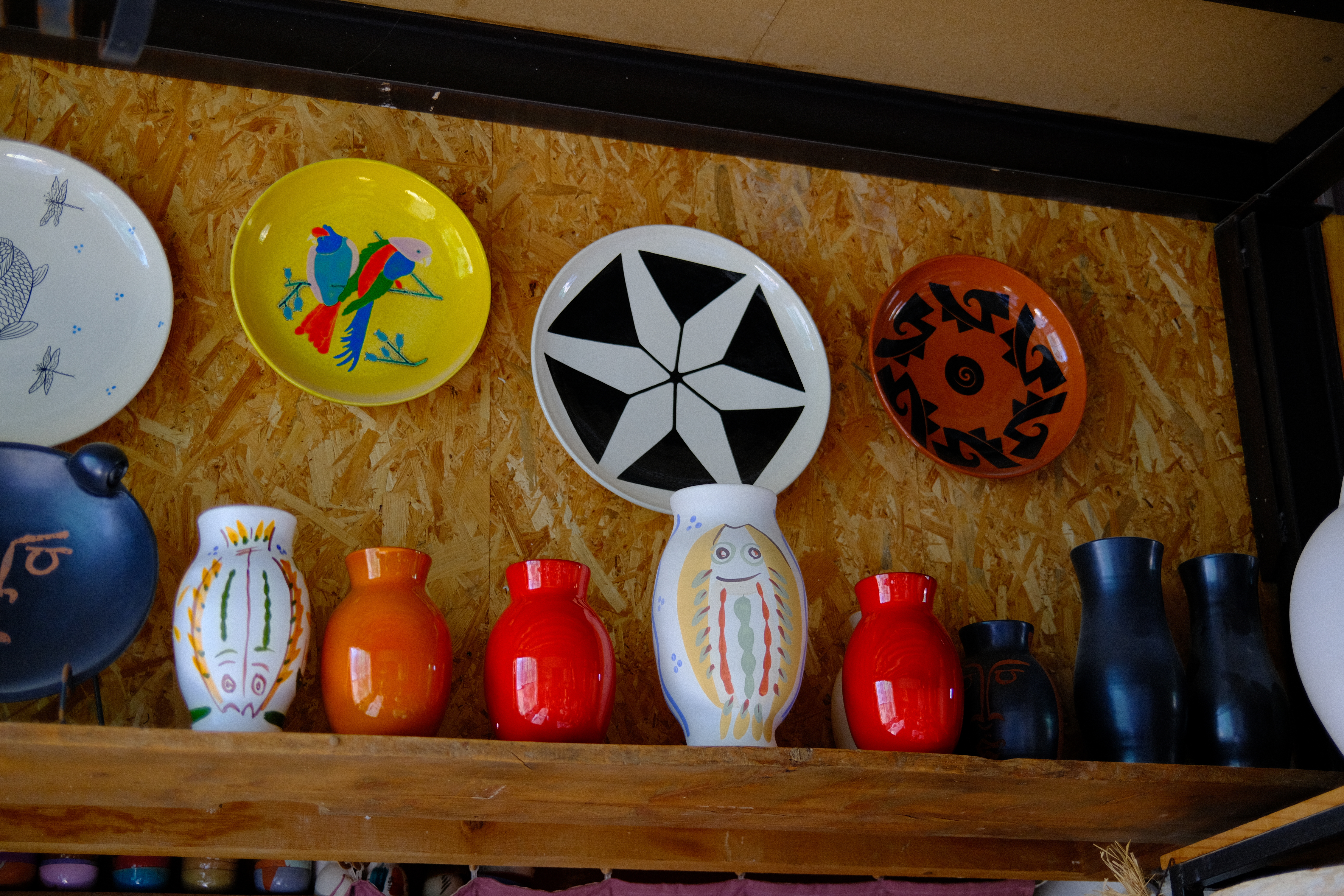 À l’intérieur, tout est chargé d’histoire, mais surtout de créations : les murs, les étagères, le bord de fenêtre. La lumière naturelle se reflète dans les émaux vifs et brillants de la vaisselle disposée tout au long de la vitre. Bien que le regard se perde d’un objet à l’autre, avide d’avoir tout observé avant de quitter le lieu, il revient incessamment sur ces bols et coupelles dont la simplicité tranche avec l’éclat.