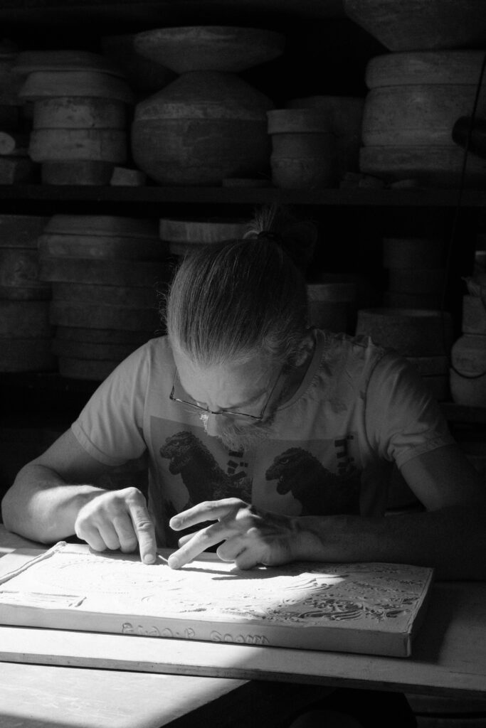 Cette trajectoire familiale n’a pourtant pas résonné comme une évidence pour Romain durant l’adolescence. Apprendre à travailler les uns avec les autres, développer sa rigueur et se sentir à la hauteur d’un tel héritage, ont été autant d’étapes à franchir. Mais un événement imprévisible et malheureux agit comme un vrai déclic : un incendie embrase l’atelier en 2015. Romain nous décrit le choc ressenti à voir « un lieu de vie sur plusieurs générations qui part en fumée ». Les flammes emportent avec elles archives familiales et pièces emblématiques des débuts de l’atelier. Le besoin de renfort de ses parents pour continuer à créer et reconstruire le lieu ramène le jeune homme de trente-et-un ans, à l’époque, dans l’entreprise familiale, après avoir passé plusieurs années à explorer différents petits boulots. Il y trouve comment associer la valeur du travail que ses expériences passées lui ont enseigné à la créativité que permet le métier de céramiste.