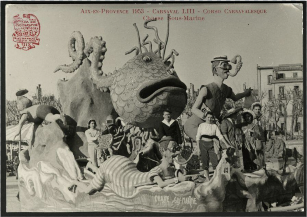 Au xxᵉ siècle, les archives photographiques — notamment celles d’Henry Ely — montrent un carnaval aixois devenu spectaculaire : chars monumentaux, têtes géantes, reines, cortèges naviguant le Cours Mirabeau. Aix entre alors dans un âge où la fête se professionnalise. La municipalité encadre, structure, orchestre. Les défilés deviennent des productions, où la recherche esthétique gagne du terrain. L’imaginaire carnavalesque provençal se mêle désormais aux codes du théâtre de rue européen : scénographies immersives, créatures articulées. Le spectacle prend le pas sur le rituel, l’image sur la satire.