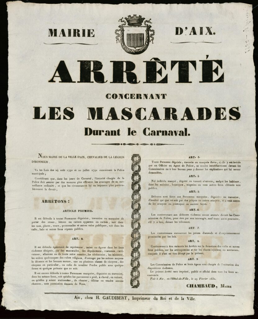 À mesure que la foule s’enhardit, la municipalité cherche à reprendre la main. Si le carnaval aixois ne naît officiellement qu’en 1888, il s’inspire les cavalcades de charité de la Mi-Carême, dont les recettes finançaient les pauvres — une générosité utile pour justifier une joie jugée parfois excessive. Très tôt, la ville réglemente. Un arrêté municipal daté du 29 février 1832, vraisemblablement publié au sortir des mascarades, en donne un aperçu savoureux : interdiction de porter armes ou cannes, de singer les religieux ou les notables, de caricaturer ses voisins, et même de chanter sans autorisation. Derrière cette minutieuse liste affleure une même inquiétude : celle de voir le carnaval devenir un espace de liberté trop anarchique, trop critique — bref, difficile à contenir. Dès lors, la ville avance sur une ligne de crête : encourager l’élan populaire, tout en tentant de contenir ce qui, dans le carnaval, s’échappe par nature.