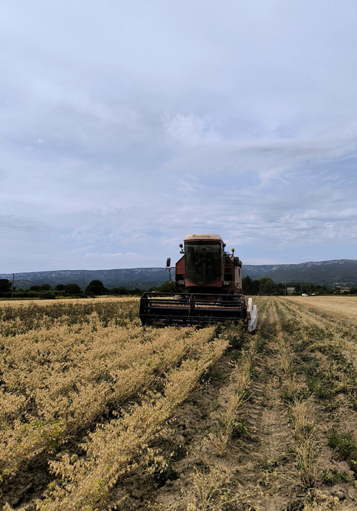 Les pois chiches se récoltent secs, lorsque les graines « sonnent » dans les gousses où elles se blottissent seules ou à deux. La culture a beau être en plein renouveau, il reste rare de pouvoir contempler ces petits grelots végétaux dans leur habitat naturel. Chaque année, à partir de mi-juillet et jusqu’à début août, Louis observe les plantes et la météo pour déterminer la date de moisson optimale. En ce 23 juillet, un orage d’avant-veille a réveillé la verdeur ambiante mais, faute de récolte, les graines pourraient s’abîmer, tomber ou être dévorées par les sangliers. Il est temps de faire tourner l’antique moissonneuse-batteuse Fiat, une top-modèle italienne que Louis partage avec son ami François Borel. Ce dernier produit de la brousse du Rove, d’autres fromages de chèvre et de l’huile d’olive à une poignée de kilomètres, dans un vallon arboré que l’on aperçoit depuis la parcelle maraîchère.