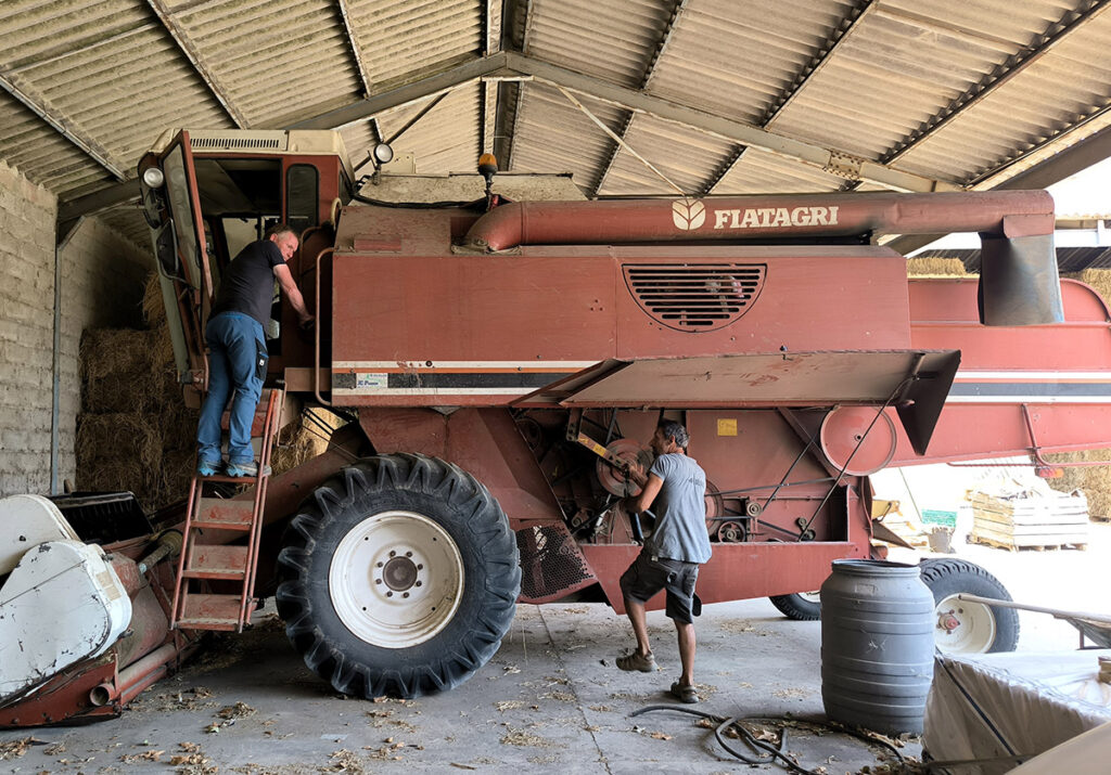 Les deux paysans option mécano nourrissent la moissonneuse au gasoil et, par souci d’économie et de potacherie, à l’huile de friture usagée. Les pois chiches, avalés en même temps que la plante, sont battus, soufflés et secoués dans le ventre de la machine. « Comme la moissonneuse est vieille et non insonorisée, on entend la musique du grain qui tombe dans le réservoir, indique François, au volant. À l’oreille, je sais que tout se passe bien. » De son côté, Louis navigue entre la terre et le toit de l’engin pour vérifier les réglages. Les graines sont triées à travers une grille dont la maille est choisie en fonction de leur taille, puis déversées dans des caisses agricoles. En raison des pluies récentes, salutaires pour les cultures, le séchage sera peaufiné en plein air.