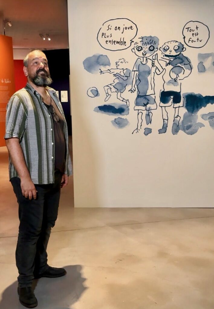 C’est par l’exploration des deux dernières publications de l’auteur parues en réaction à l’effroi du 7 octobre 2023 : Nous vivrons et Que faire des juifs ? que débute l’exposition. Deux romans graphiques guidés par le réflexe de ne pas s’enfermer dans la sidération et de se tourner encore et toujours vers les autres, avec l’objectif d’alerter face à l’explosion de l’antisémitisme et à la montée de tous les racismes. Joann Sfar, qui déclarait « être juif 5 minutes par jour » avant le 7 octobre, est allé à la rencontre d’un maximum de personnes pour recueillir leurs témoignages et les mettre en image par le dessin. Et pourquoi pas par l’humour.