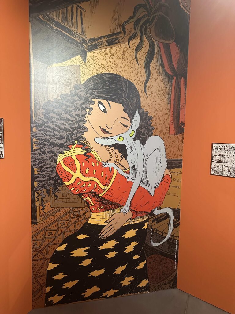 Le reste du parcours de l’exposition nous plonge dans l’enfance de l’artiste passée à Nice au sein d’une famille à la double culture : ashkénaze d’Ukraine par sa mère, et sépharade d’Algérie par son père. Ces sources d’inspiration ont imprégné les univers de l’auteur, de la célèbre bande dessinée Le Chat du rabbin, dont l’histoire se déroule en Algérie avant l’indépendance, au roman graphique Klezmer, qui s’intéresse à l’exil des juifs fuyant les pogroms de la région d’Odessa au début du xxe siècle. Chacune de ces œuvres entraîne le visiteur au cœur des émotions et des questionnements philosophiques, finalement universalistes, de son auteur. Une des dernières planches présentées, tirée de l’œuvre Klezmer, illustre un village après le pogrom de Kichinev de 1903. Le village est déserté, les maisons sont figées. Aucun texte ni aucune forme humaine n’y sont représentés. Le cri du silence est alors préféré pour témoigner de l’horreur sans tomber dans le voyeurisme. Le dialogue intérieur s’invite à la pensée de chacun. Si en psychologie il est d’usage d’affirmer que la parole libère, les œuvres de Sfar, elles, pourraient trouver comme adage : le dessin libère les âmes qui souhaitent juste bien vivre ensemble.